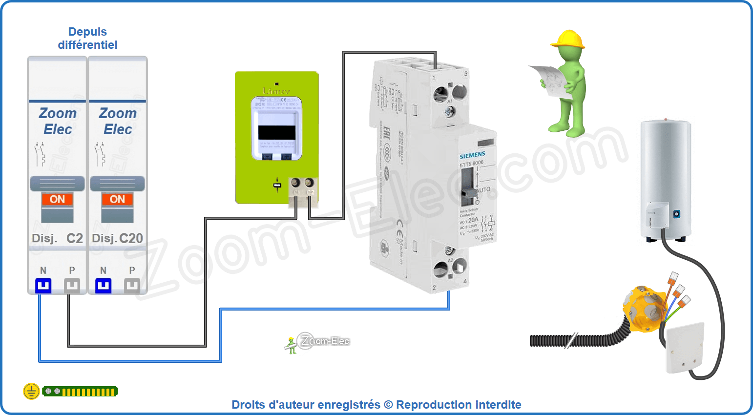 - la phase d'alimentation du chauffe-eau est branchée avant contact en borne 3
